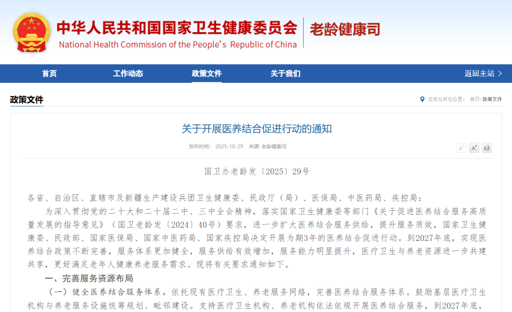 國家層面密集出臺的政策文件,為功能醫(yī)學(xué)全鏈?zhǔn)浇】倒芾砑夹g(shù)設(shè)備的場景應(yīng)用搭建了完善的制度框架。10月29日,國家衛(wèi)健委等五部門聯(lián)合發(fā)布《關(guān)于開展醫(yī)養(yǎng)結(jié)合促進(jìn)行動的通知》,明確提出為期3年的醫(yī)養(yǎng)結(jié)合促進(jìn)行動,要求到2027年底實(shí)現(xiàn)醫(yī)養(yǎng)結(jié)合服務(wù)縣域全覆蓋,并支持醫(yī)療衛(wèi)生機(jī)構(gòu)轉(zhuǎn)型康復(fù)醫(yī)院、護(hù)理院,鼓勵養(yǎng)老機(jī)構(gòu)內(nèi)設(shè)醫(yī)務(wù)室、護(hù)理站并賦予相應(yīng)處方權(quán)。這一政策直接擴(kuò)大了功能醫(yī)學(xué)設(shè)備的應(yīng)用場景,從專業(yè)醫(yī)療機(jī)構(gòu)延伸至養(yǎng)老服務(wù)設(shè)施,為全鏈?zhǔn)浇】倒芾硖峁┝藦V闊的落地載體。