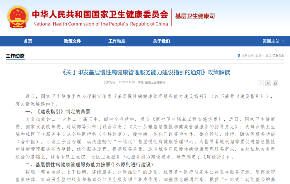 慢性病管理是基層醫(yī)療衛(wèi)生服務(wù)的核心任務(wù)之一,關(guān)乎億萬群眾的健康福祉。11月20日,國家衛(wèi)生健康委辦公廳正式發(fā)布《基層慢性病健康管理服務(wù)能力建設(shè)指引》(以下簡稱《指引》),明確提出指導(dǎo)各地根據(jù)實際需求促進基層慢性病健康管理服務(wù)能力建設(shè),推動提供“一站式”功能整合的健康管理服務(wù),這一舉措將為基層慢性病管理領(lǐng)域帶來全新變革,讓群眾在家門口就能享受到全周期、一體化的健康保障。