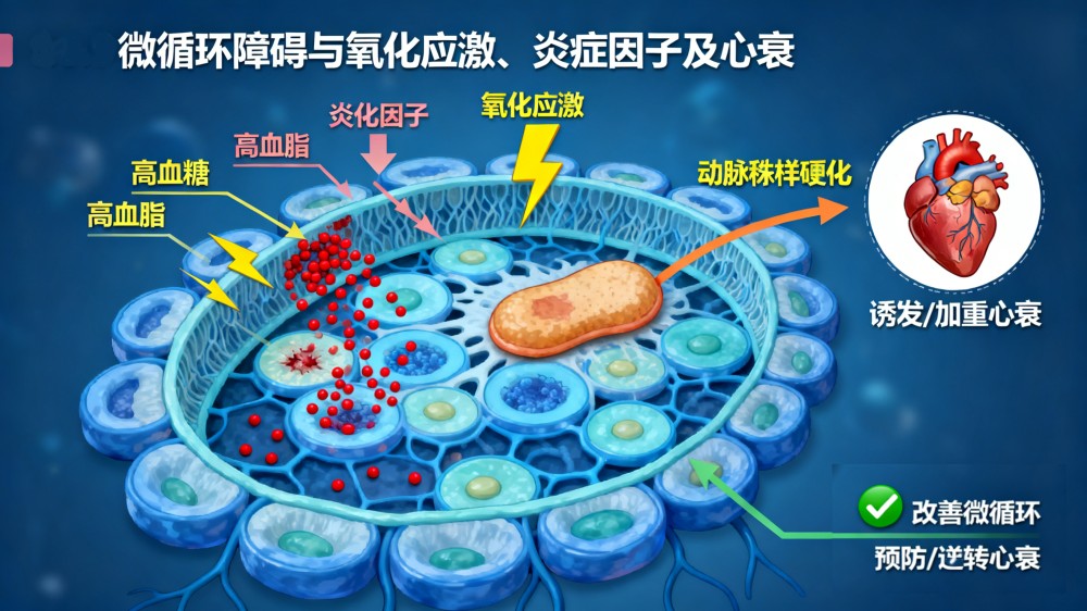 微循環(huán)障礙是心衰進(jìn)展的核心機(jī)制之一。當(dāng)心臟功能下降時(shí),微血管網(wǎng)絡(luò)因血流減少、血管內(nèi)皮損傷而功能失調(diào),導(dǎo)致組織缺氧和代謝廢物堆積。這會(huì)進(jìn)一步削弱心肌收縮力,形成“心衰—微循環(huán)障礙—心衰加重”的惡性循環(huán)。功能醫(yī)學(xué)研究發(fā)現(xiàn),微循環(huán)障礙還與氧化應(yīng)激和炎癥因子釋放密切相關(guān),例如,高血糖或高血脂環(huán)境會(huì)加劇血管內(nèi)皮損傷,促進(jìn)動(dòng)脈粥樣硬化,最終誘發(fā)或加重心衰。因此,改善微循環(huán)成為預(yù)防和逆轉(zhuǎn)心衰的關(guān)鍵靶點(diǎn)。