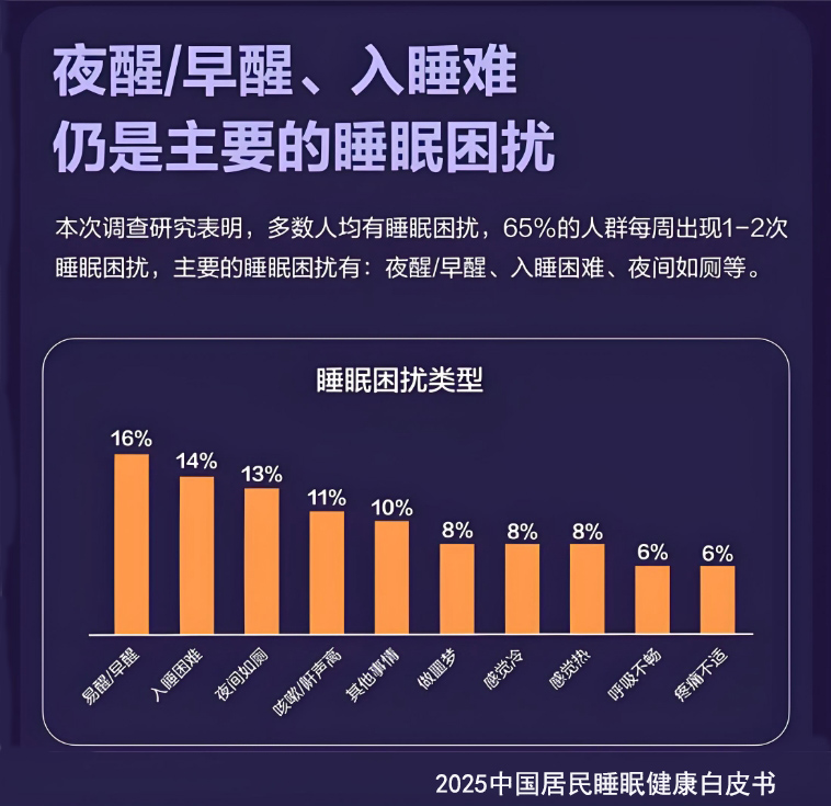 《2025中國(guó)居民睡眠健康白皮書(shū)》顯示:我國(guó)居民整體睡眠狀況不容樂(lè)觀,超過(guò)65%的受訪者長(zhǎng)期存在睡眠困擾,夜間睡眠時(shí)長(zhǎng)普遍偏短,總體睡眠質(zhì)量欠佳。