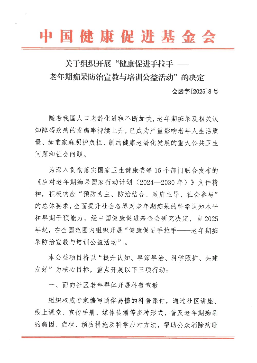 2025年11月18日,中國健康促進(jìn)基金會(huì)正式發(fā)布《關(guān)于組織開展“健康促進(jìn)手拉手——老年期癡呆防治宣教與培訓(xùn)公益活動(dòng)”的決定》(會(huì)字[2025]8號(hào)),宣布自2025年起在全國范圍內(nèi)啟動(dòng)老年期癡呆防治宣教與培訓(xùn)公益項(xiàng)目。