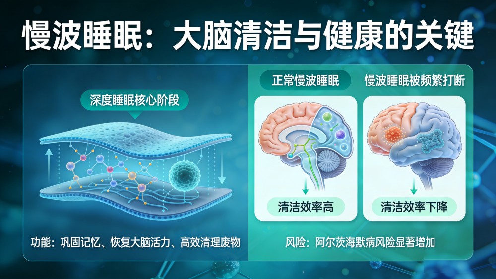 進一步的研究更精準地指出,慢波睡眠的減少,是阿爾茨海默病風險升高的重要信號。慢波睡眠作為深度睡眠的核心階段,不僅能幫助我們鞏固記憶、恢復大腦活力,更是大腦高效清理廢物的關鍵時期。當慢波睡眠被頻繁打斷,大腦的“清潔效率”會大幅下降,有害物質(zhì)持續(xù)堆積,就會讓患阿爾茨海默病的風險顯著增加。