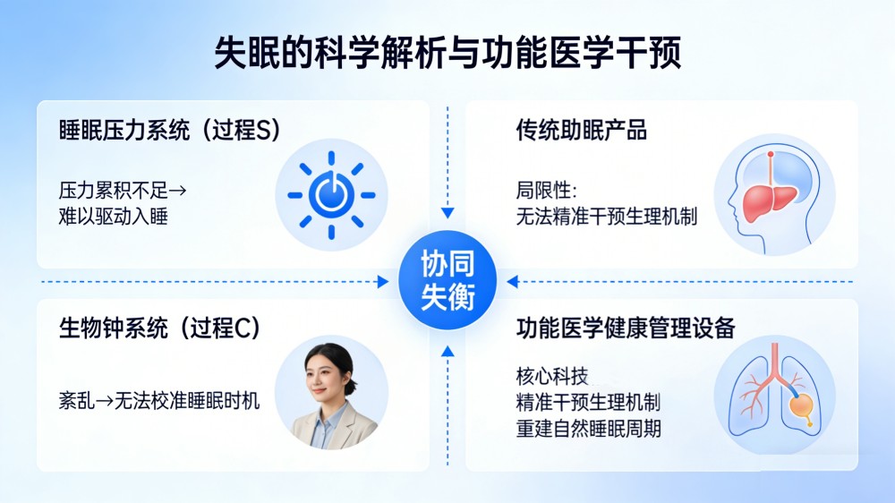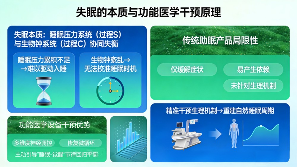 從睡眠科學(xué)視角來看,失眠的本質(zhì)是“睡眠壓力系統(tǒng)(過程S)”與“生物鐘系統(tǒng)(過程C)”的協(xié)同失衡——要么是睡眠壓力累積不足,難以驅(qū)動入睡;要么是生物鐘紊亂,無法精準(zhǔn)校準(zhǔn)睡眠時機(jī)。傳統(tǒng)助眠產(chǎn)品的局限性,讓人們將目光投向了功能醫(yī)學(xué)領(lǐng)域的創(chuàng)新技術(shù)。臨床實(shí)踐證實(shí),搭載核心科技的功能醫(yī)學(xué)健康管理設(shè)備,能從生理機(jī)制層面精準(zhǔn)干預(yù),幫助人體重建自然睡眠周期。